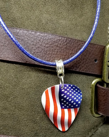 American Flag Guitar Pick Necklace with Rolled Blue Cord