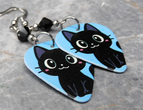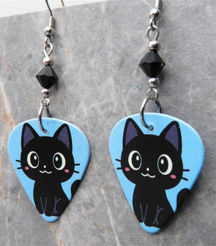 These earrings are made with guitar picks printed with an anime style black cat. So cute! The image is printed the same on both sides of the pick. Between the guitar pick and the earwire I used a 6mm jet black genuine Swarovski crystal bicone on both earrings.