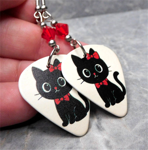 These earrings are made with guitar picks printed with an semi-anime style black cat with a red bow on her head. Really cute! The image is printed the same on both sides of the pick. Between the guitar pick and the earwire I used a 6mm red genuine Swarovski crystal bicone on both earrings.