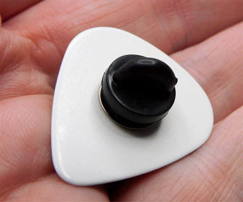 This lapel pin or tie tack is made with an Arctic Monkeys guitar pick. It is a real guitar pick.