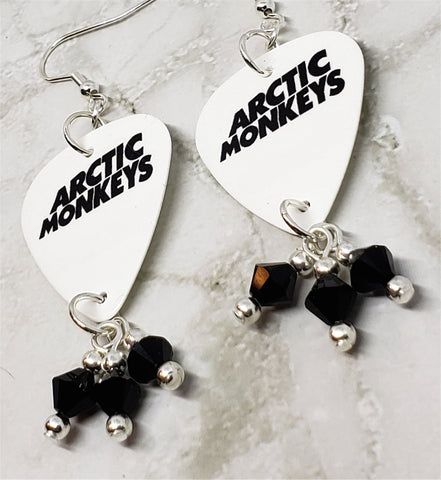 These are made with white Arctic Monkeys guitar picks with the band name in black. I danged three 6mm jet black genuine Swarovski crystal bicones from each earring.