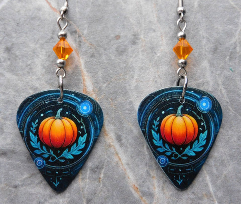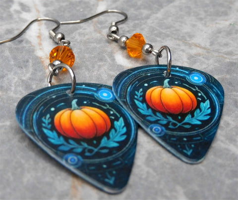 These earrings are made with beautiful guitar picks that have a pumpkin on an embellished teal background. The guitar picks are printed on both sides. Between the guitar pick and the earwire I used an orange 6mm genuine Swarovski crystal bicone on each earring.