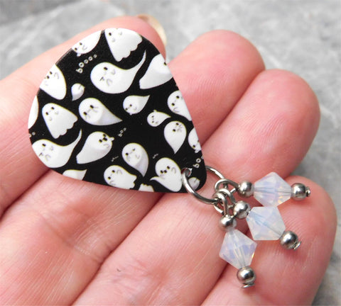 Halloween Boo Ghost Guitar Pick Pin or Tie Tack with White Opal Swarovski Crystal Dangles