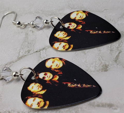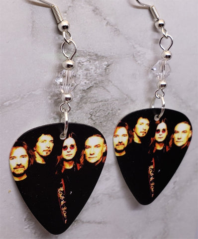 Black Sabbath Group Picture Guitar Pick Earrings with Clear Swarovski Crystals