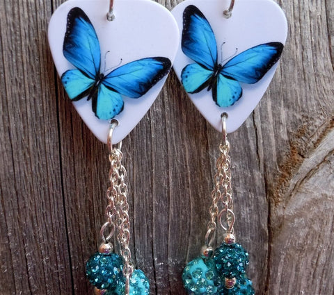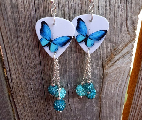Aqua Blue Butterfly Guitar Pick Earrings with Aqua and Teal Pave Bead Dangles