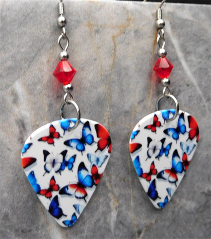 Red, White, and Blue Butterflies Guitar Pick Earrings with Red Swarovski Crystals