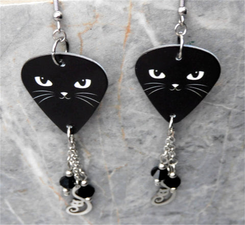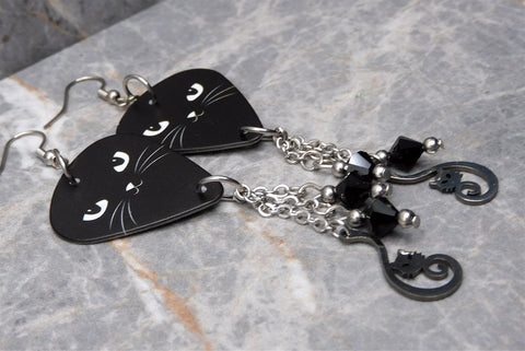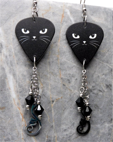 Black Cat Face Guitar Pick Earrings with Stainless Steel Cat Charm And Black Swarovski Crystal Dangles