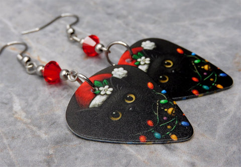 Black Cat with a Santa Hat and Christmas Lights Guitar Pick Earrings with Red Swarovski Crystals