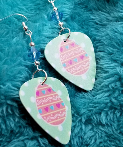 These Easter earrings are made on mint green guitar picks with white polka dots. In the middle they are printed with a pink Easter Egg decorated with pink and blue hearts. Between the guitar picks and the earwires I used a 6mm aquamarine genuine Swarovski crystal bicone on each earring.