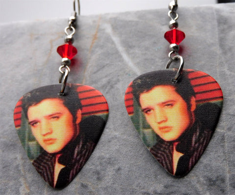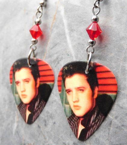 These are made with Elvis Presley guitar picks. Between the guitar picks and the earwires I used a 6mm red genuine Swarovski crystal bicone on each earring.