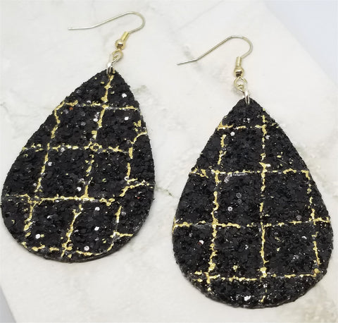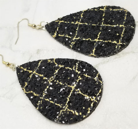 Black Glitter with Gold Outline Brick Pattern Very Sparkly Double Sided FAUX Leather Teardrop Earrings