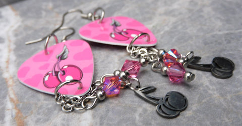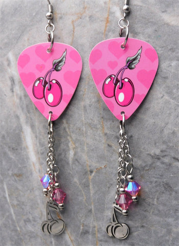 Cherries and Hearts Guitar Pick Earrings with Stainless Steel Cherry Charms and Pink AB Swarovski Crystal Dangles