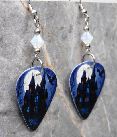These earrings are made with Spooky House guitar picks. It is a black house in front of a very large full moon. There is a large owl flying in the air. The same image is printed on the front and the back of the guitar pick. Between the guitar pick and the earwire I used a white opal 6mm genuine Swarovski crystal bicone on each earring.