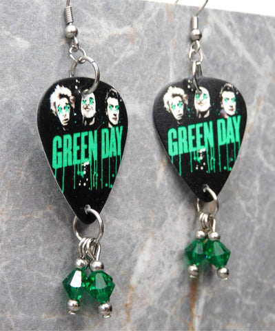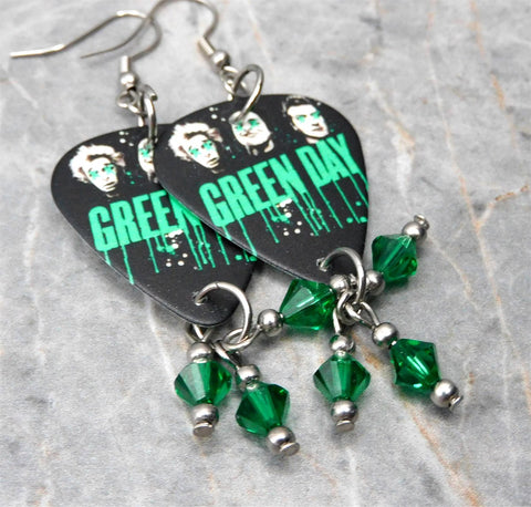 These earrings are made with Green Day guitar picks. I used stainless steel findings to dangle three green 6mm genuine Swarovski crystal bicones from each earring.
