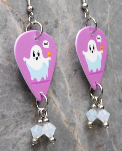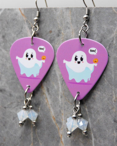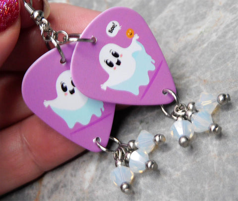 Boo Ghost with Jack o Lantern Guitar Pick Earrings with White Opal Swarovski Crystal Dangles
