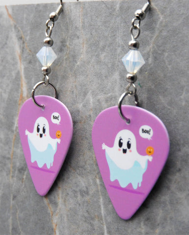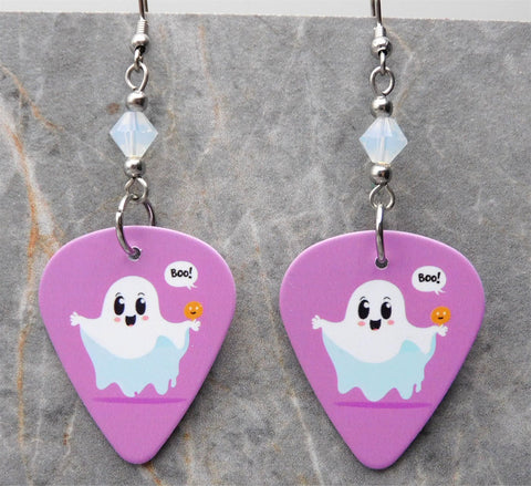 These earrings are made with guitar picks with an adorable ghost holding a jack o lantern. This ghost also has a dialogue bubble that says "Boo!" The image is on both sides of the guitar picks. Between the guitar pick and the earwire I used a white opal 6mm genuine Swarovski crystal bicone on each earring.