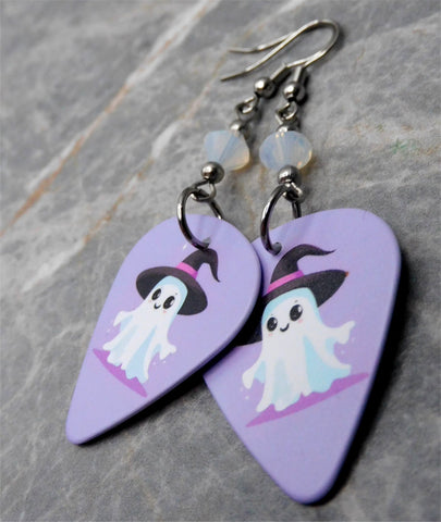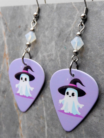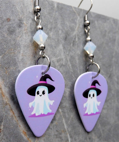 These earrings are made with guitar picks of an adorable ghost with a witch or wizard (or sorcerer?) hat on a purple background. Between the guitar pick and the earwire I used an opal 6mm genuine Swarovski crystal bicone on each earring.
