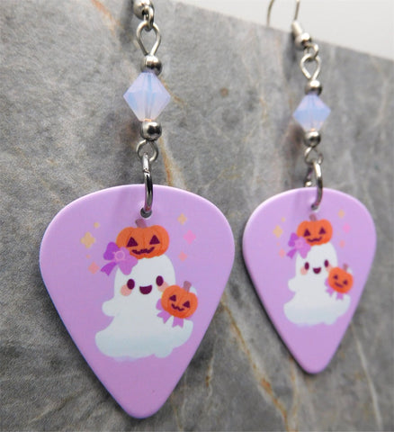 Ghost with Jack o Lanterns Guitar Pick Earrings with Lavender Opal Swarovski Crystals