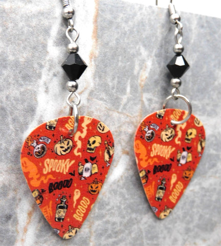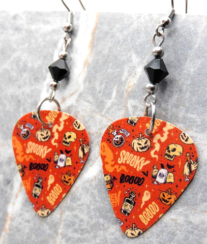These earrings are made on Halloween themed wrapping paper style patterned guitar picks. Between the guitar pick and the earwire I used a black 6mm genuine Swarovski crystal bicone on each earring.