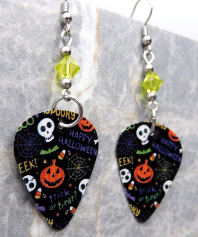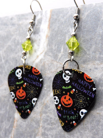 These earrings are made on Halloween themed wrapping paper style patterned guitar picks. Between the guitar pick and the earwire I used a citrus green 6mm genuine Swarovski crystal bicone on each earring.