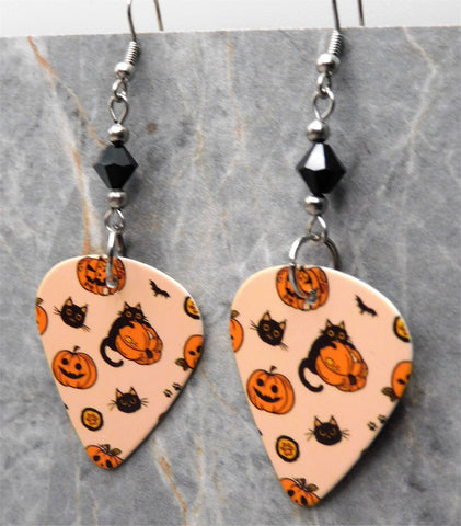 Halloween Jack o' Lantern and Black Cat Guitar Pick Earrings Black Swarovski Crystals