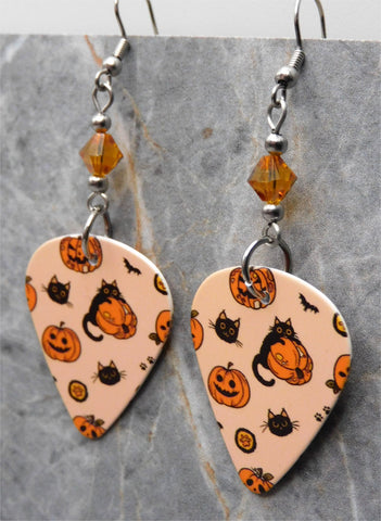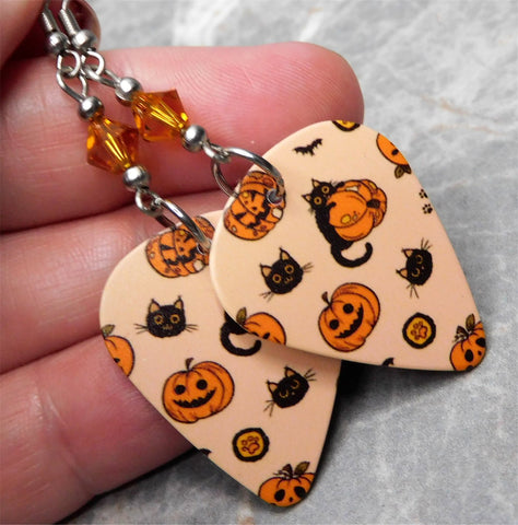 Halloween Jack o' Lantern and Black Cat Guitar Pick Earrings Orange Swarovski Crystals