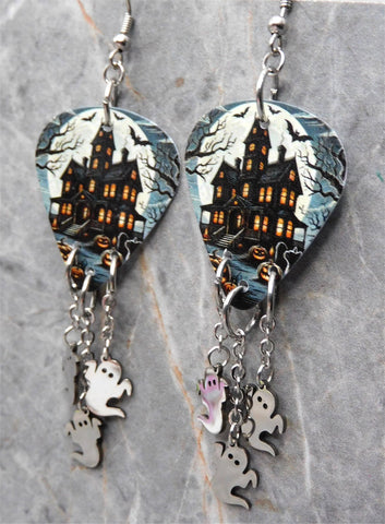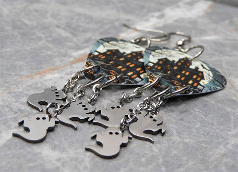 Haunted House Guitar Pick Earrings with Ghost Stainless Steel Charm Ghost Dangles