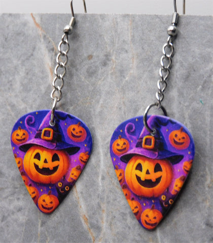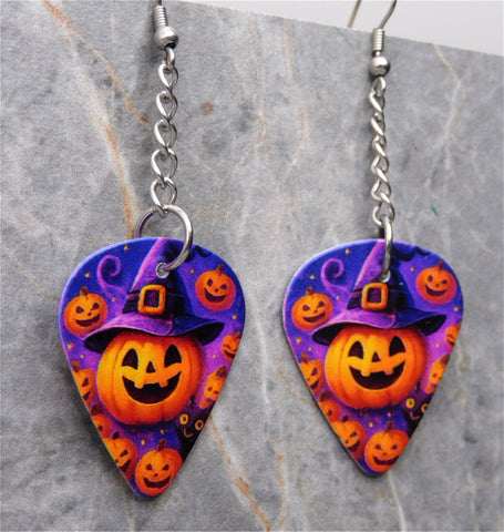 Jack o' Lantern with Witch or Wizard Hat Dangling Guitar Pick Earrings