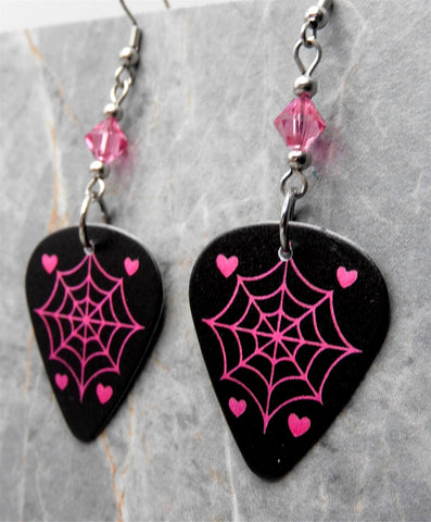 Spiderweb and Hearts Guitar Pick Earrings with Pink Swarovski Crystals