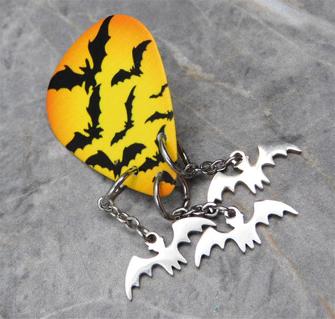 Swarm of Bats Guitar Pick Pin or Tie Tack with Stainless Steel Bat Charm Dangles