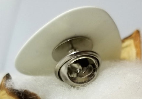 The pick is 1.25 inches long from the top to bottom and 1 inch at it's widest point. On the back of the pick I secured the pin and used a PVC rubber clutch. I also have the metal clutches if you prefer! Just let me know.
