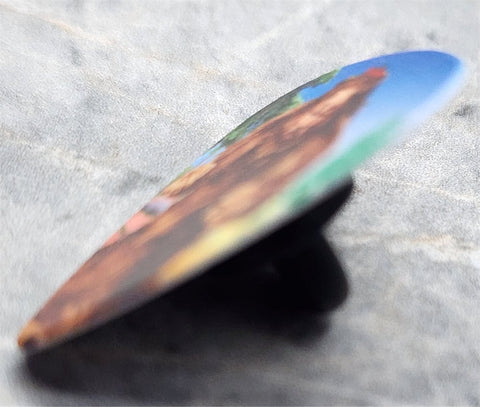 This lapel pin or tie tack is made with a The Wizard of Oz Cowardly Lion guitar pick. It is a real guitar pick.