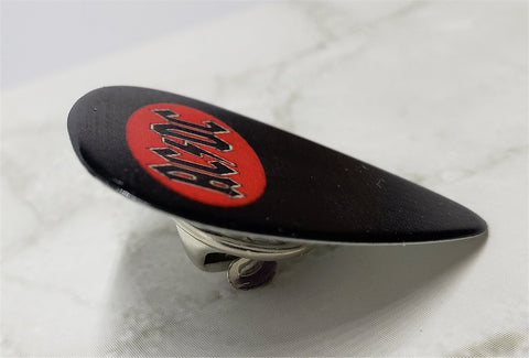 This lapel pin or tie tack is made with an AC/DC guitar pick. It is a real guitar pick.