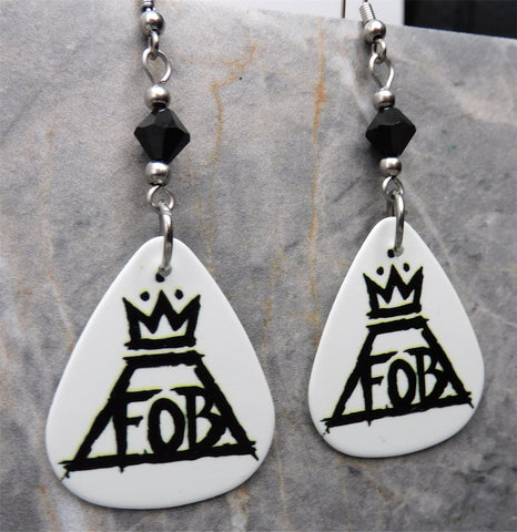 These earrings are made with Fall Out Boy FOB emblem white guitar picks. Between the guitar pick and the earwire I used a jet black 6mm genuine Swarovski crystal bicone on each earring.