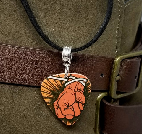 This necklace is made with a Metallica St Anger guitar pick as the pendant. The front of the pick is the album artwork, and the back of the pick says "Metallica" in white and their iconic logo. I also used black sueded cord.