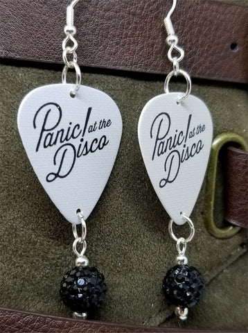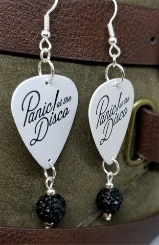 These earrings are made with Panic! At The Disco guitar picks. I dangled a 10mm black pave bead from each earring.