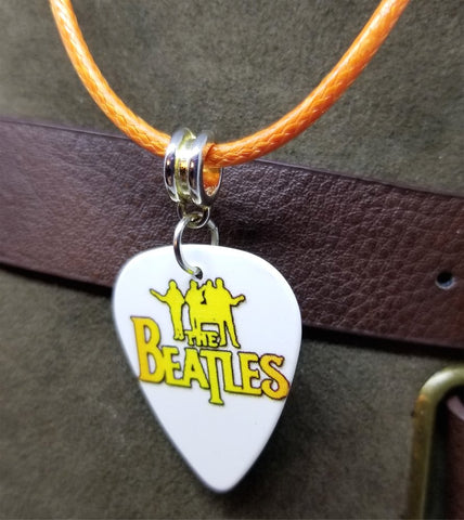 This necklace is made with orange rolled cord. I used a The Beatles guitar pick as the pendant.