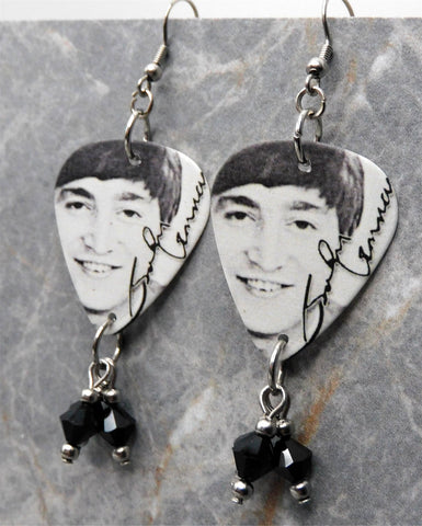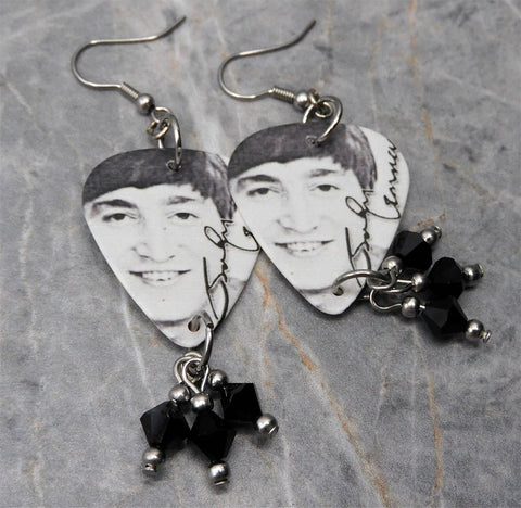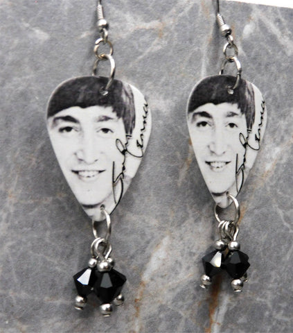These are made on guitar picks that feature a black and white picture of John Lennon with his autograph printed on the side. I dangled three jet black 6mm genuine Swarovski crystal bicones from each earring.