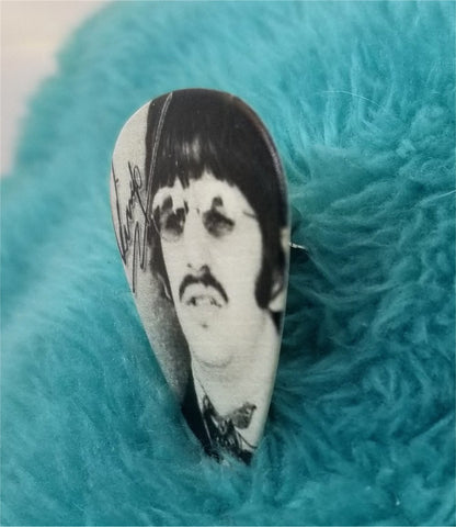 This lapel pin or tie tack is made with a Beatles Ringo Starr guitar pick. It is made with a real guitar pick.