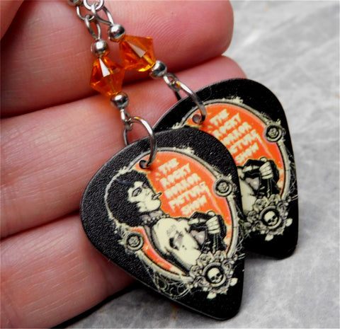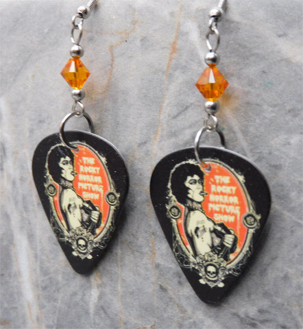 These earrings are made with The Rocky Horror Picture Show guitar picks. The same image is printed on both the front and back of the guitar picks. Between the guitar pick and the earwire I used a 6mm orange genuine Swarovski crystal bicone on each earring.