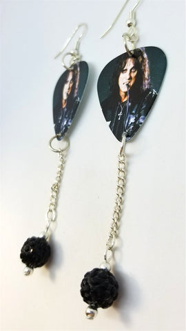 Alice Cooper Biting His Riding Crop Guitar Pick Earrings with Black Pave Bead Dangles