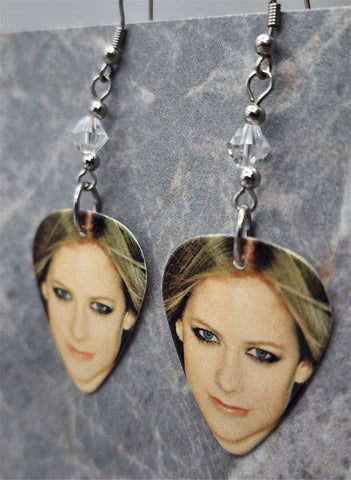 These earrings are made with Avril Lavigne guitar picks. Between the guitar pick and the earwire I used a 6mm clear genuine Swarovski crystal bicone on each earring.