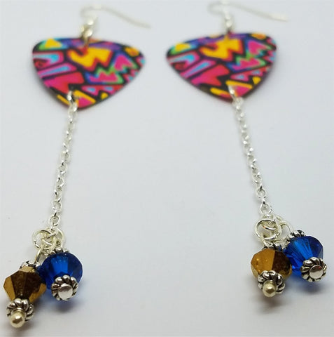 Brightly Colored Graffiti Style Guitar Pick Earrings with Capri Blue and Gold Swarovski Crystals