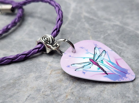 This necklace is made with a beautiful dragonfly scene printed on it. I used a braided purple cord.