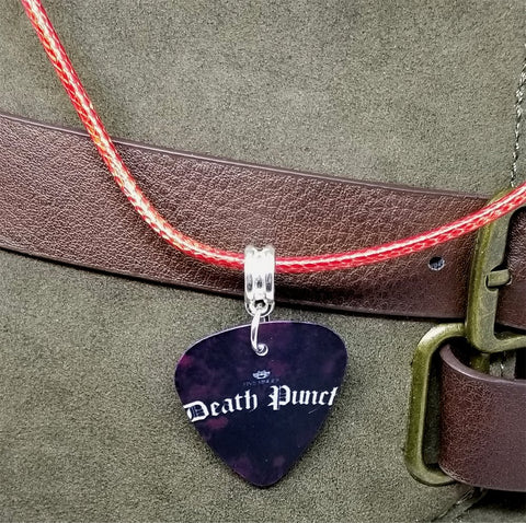 This necklace is made with red rolled cord. I used a Five Finger Death Punch guitar pick. The image is printed on both sides of the guitar pick.