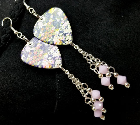 Flowered Origami Paper Style Guitar Pick Earrings with Pink Alabaster Swarovski Crystal Dangles