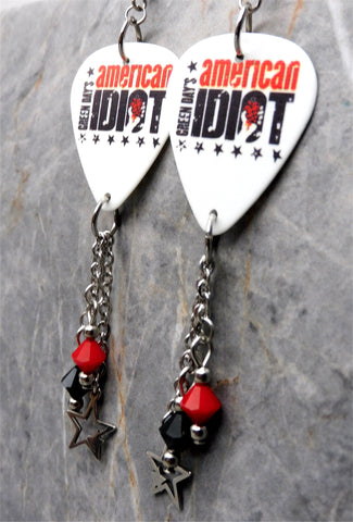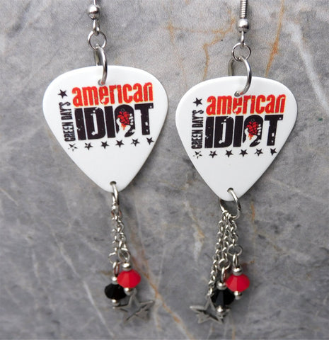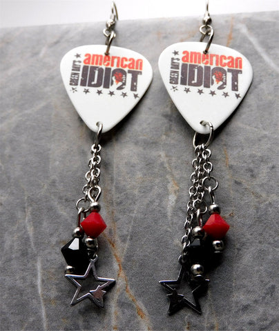Green Day American Idiot White Guitar Pick Earrings with Stainless Steel Star Charm and Swarovski Crystal Dangles