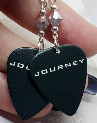 These earrings are made with Journey Raised on Radio guitar picks. The front of the picks had the image from the album and the back of the picks are black and say "Journey" in white. Between the guitar pick and the earwire I used a metallic silver 6mm genuine Swarovski crystal bicone on each earring.