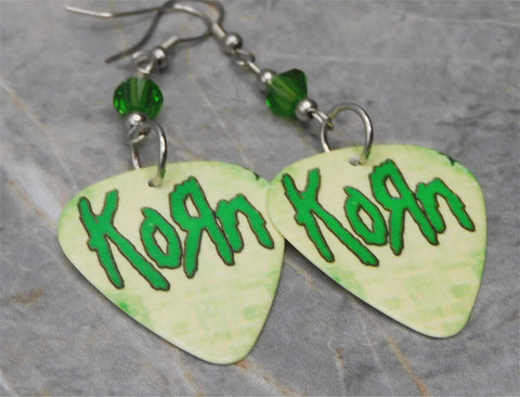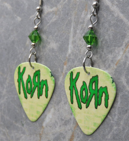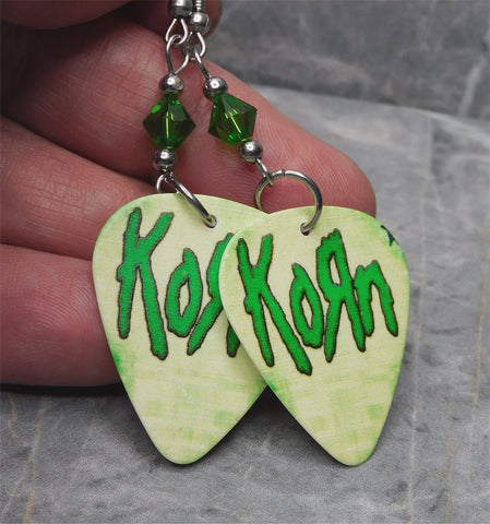 These are made with Korn green guitar picks. The front of the pick is printed "Korn" in darker green and in the Korn font that is so recognizable. The back of the pick is white.
