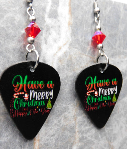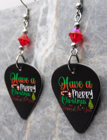 Merry Christmas and Happy New Year Guitar Pick Earrings with Red Swarovski Crystals
